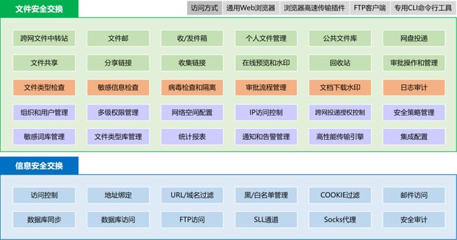 我们还是以《Ftrans网络安全隔离与信息交换系统》为例来介绍,这款产品具备文件、数据库、音视频数据、应用协议代理、工业协议等同步功能,兼容 IPv4/IPv6 混合网络,同时支持CUTP协议、HTTP/HTTPS协议、FTP/FTPS/SFTP协议、WebDAV协议、SCP协议等。系统支持数据库同步、人与人之间的跨网文件交换。