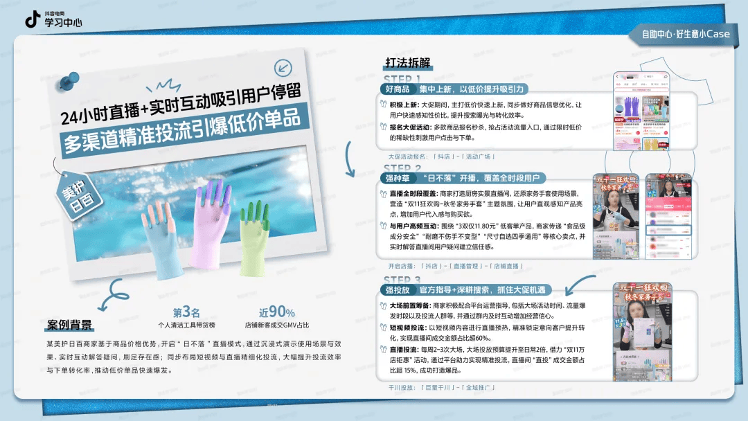 内容场,直播间保持24小时不间断开播,还特意搭建了日常厨房场景,以此打造“双11狂欢购-秋冬家务手套”的专属氛围,让用户一眼就能联想到产品使用场景,大幅增强代入感。在流量高峰时段,面对30-50岁的核心女性用户群体,主播话术精准聚焦食品级材质、耐磨不变形、四季通用”、等核心卖点,还会通过实时互动解答用户常见疑问降低决策顾虑。10月25日专场,直播间带货榜从TOP9提升至TOP3,实现了突破性增长。