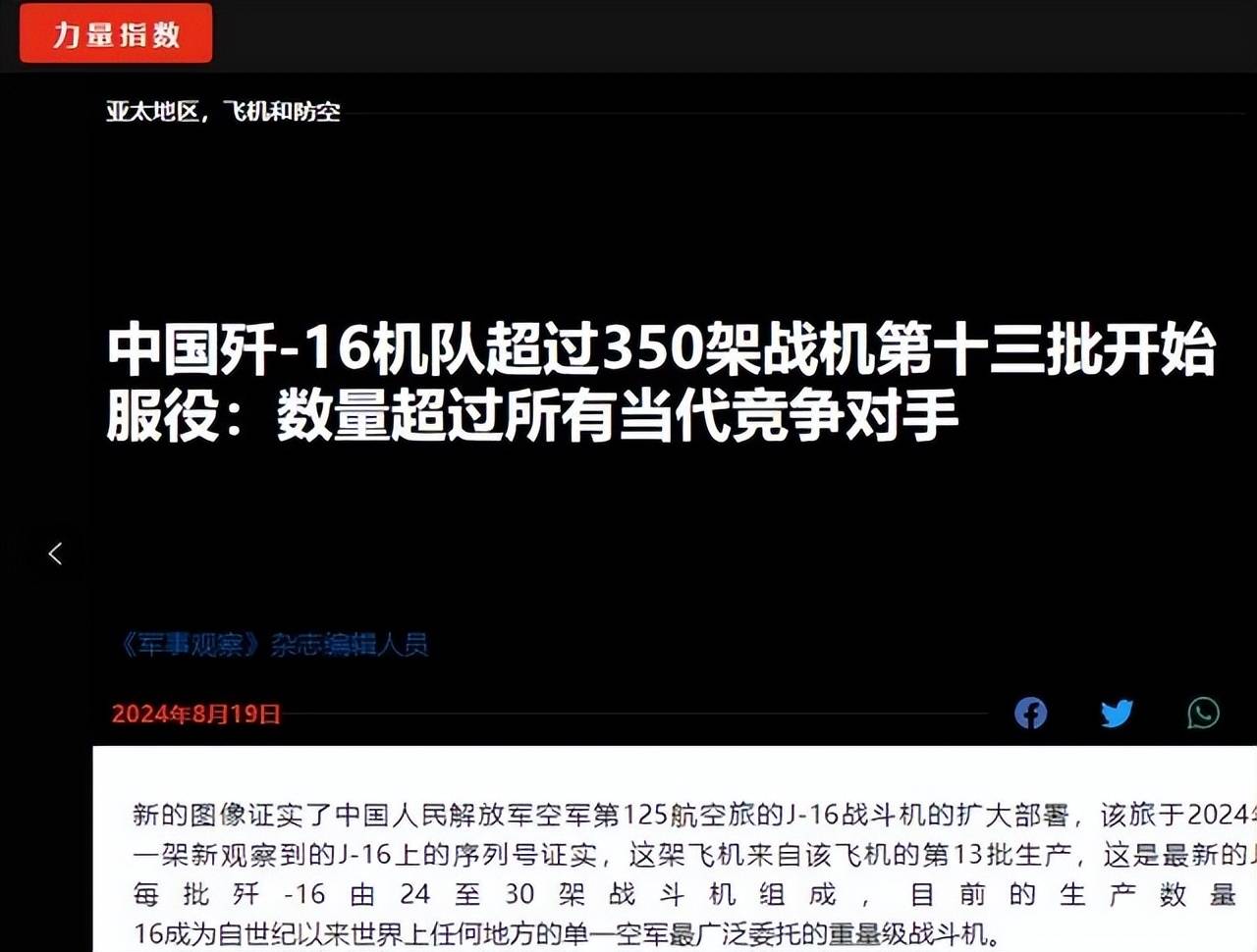 2024年8月,基于美媒通过卫星图像和公开信息的分析,确认中国开始交付第十三批歼-16。这一事件标志着中国空军在重型战斗机领域的扩张进入了规模化阶段。歼-16的总数量已经超过350架,这不仅刷新了全球同类战机的数量纪录,还体现了中国航空工业从技术积累到高效生产的完整能力。