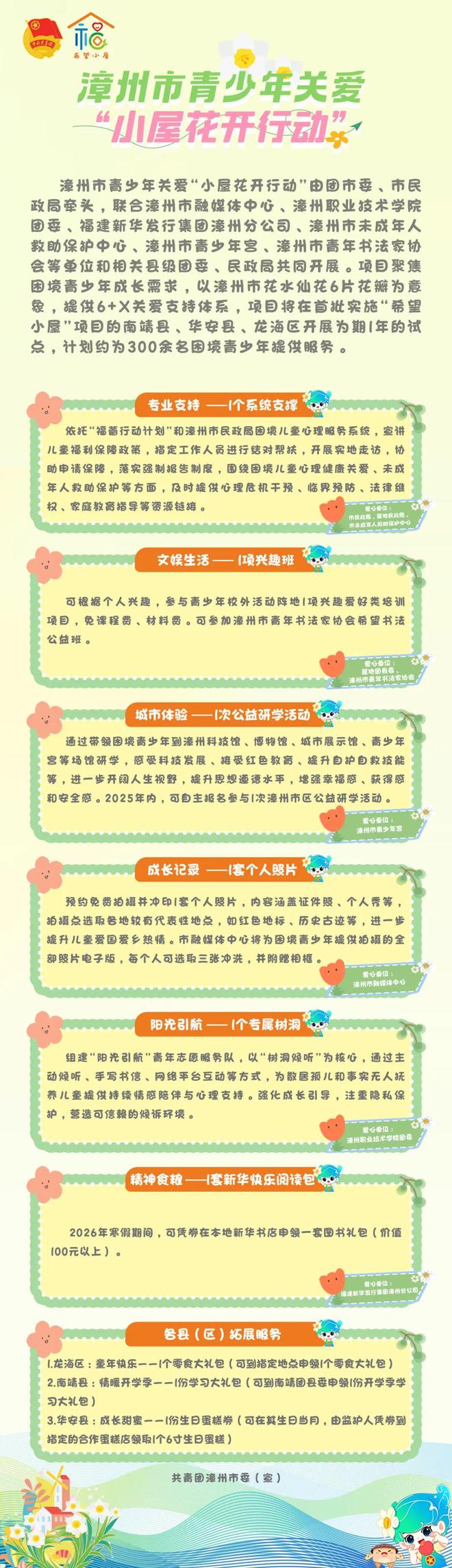 “6”项基础服务分别为1个系统支撑、1项兴趣班、1次公益研学、1套个人照片、1个专属树洞、1套新华快乐阅读包,“X”则代表着各县级团委提供的零食大礼包、学习大礼包、生日蛋糕券等拓展服务。项目将以首批实施“希望小屋”项目的南靖县、华安县、龙海区为试点,计划为300余名困境青少年提供服务。